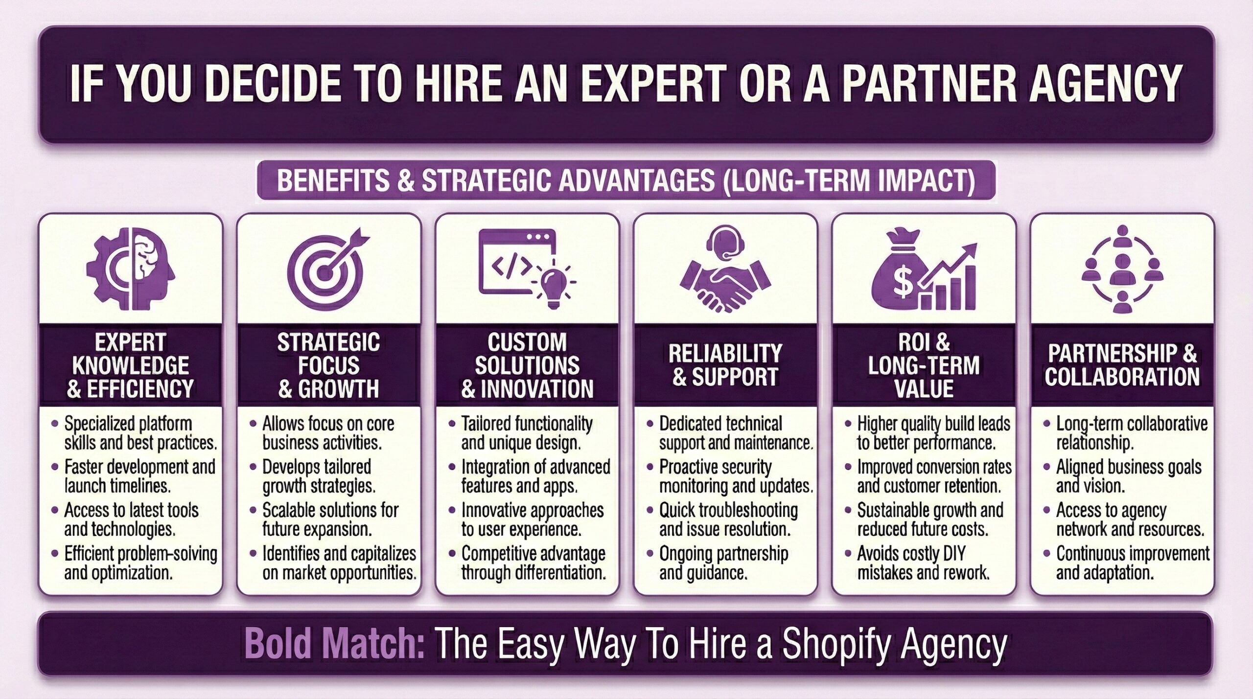 Look. Eric and I came up with the idea for Bold Match specifically because finding the right expert help was harder than it had to be. The concierge services that existed were either over-focused on freelance consultants who weren’t much good beyond a certain growth point, taking commissions that created misaligned incentives or both. Partner Agencies were getting pushed toward merchants who weren’t good fits just because the deal closed. So I’m not going to pretend there’s a one-size-fits-all answer. Your business is different from the next e-commerce retailer’s business. Your technical comfort level is different. Your budget is different. Your growth timeline is different too.