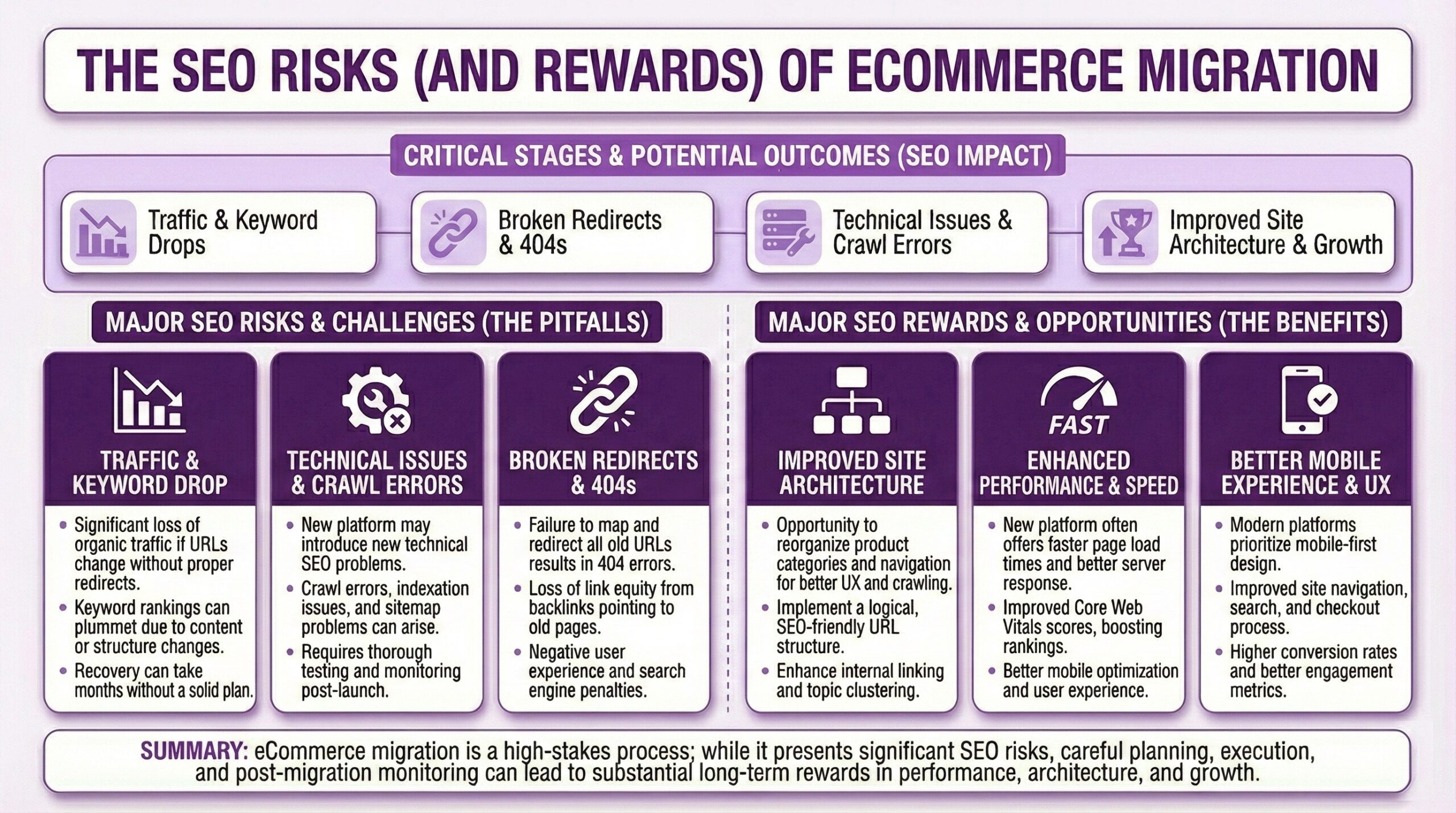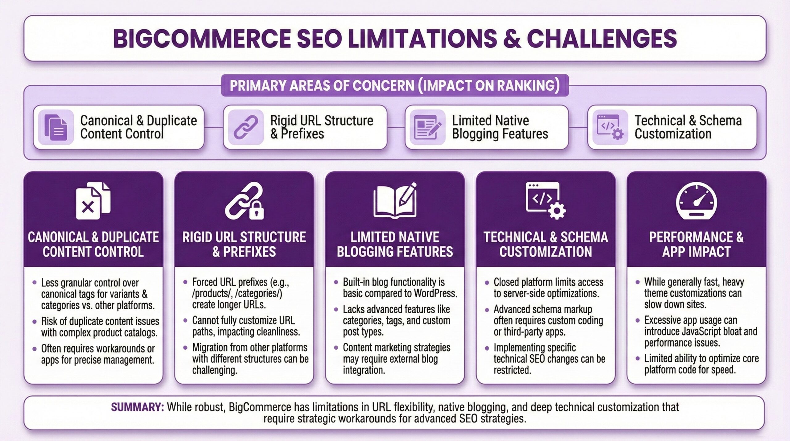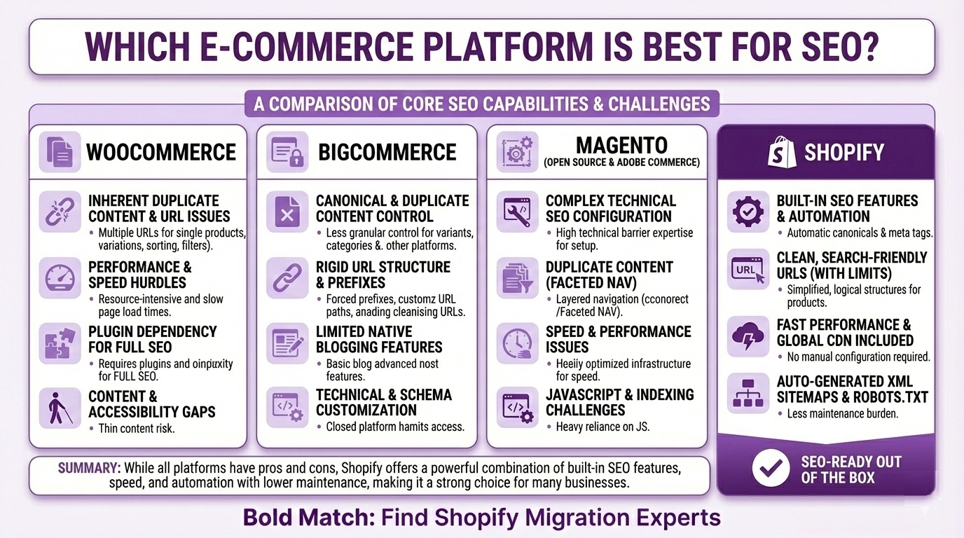 Every e-commerce platform has its quirks, and many of those quirks create search engine optimization problems that compound over time. Understanding what you’re escaping helps you appreciate both the opportunity, and all the risks of migrating to a new platform.