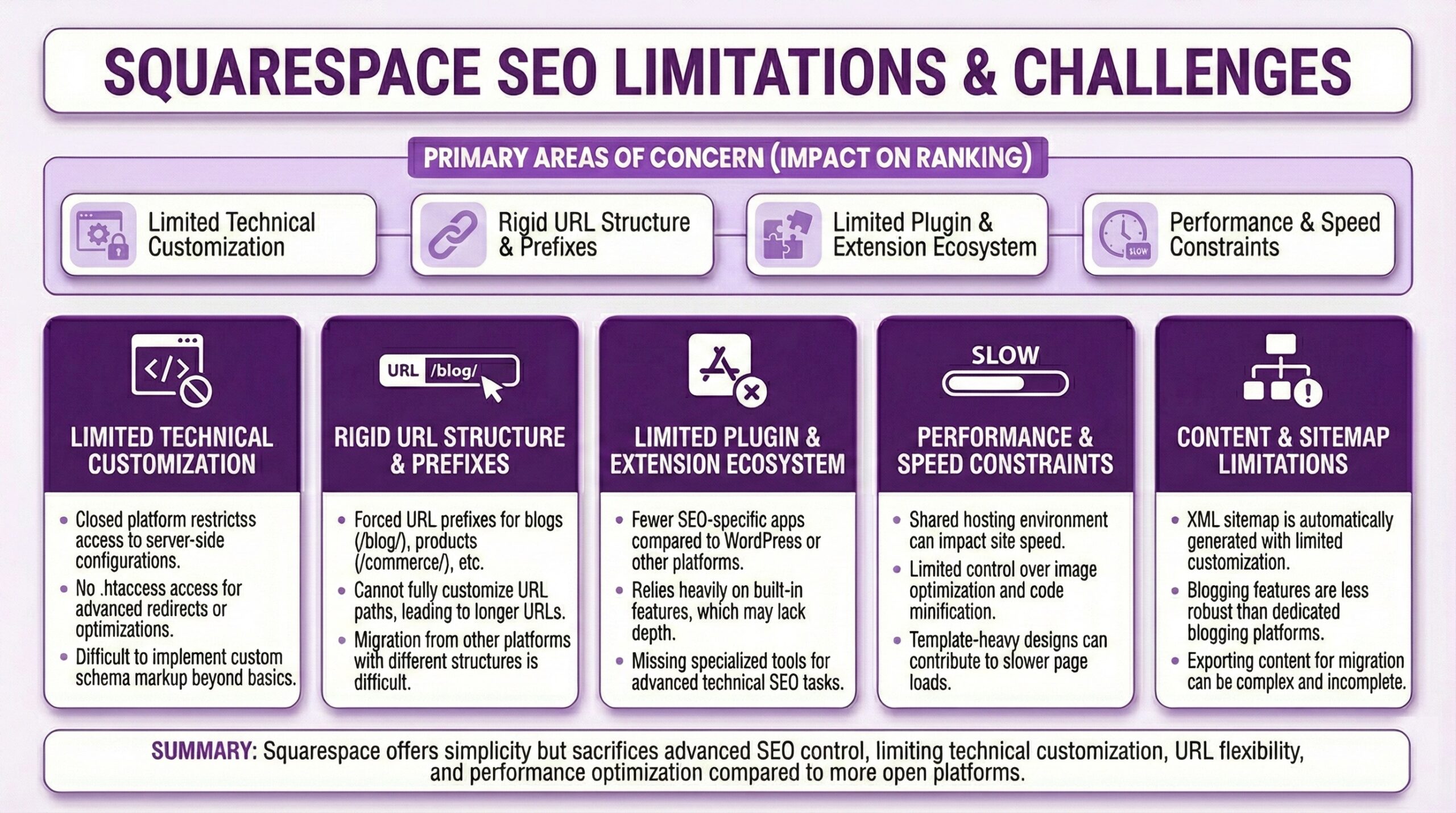 Restricted URL structure options. Squarespace imposes URL patterns that may not align with SEO best practices or your existing URL structure.