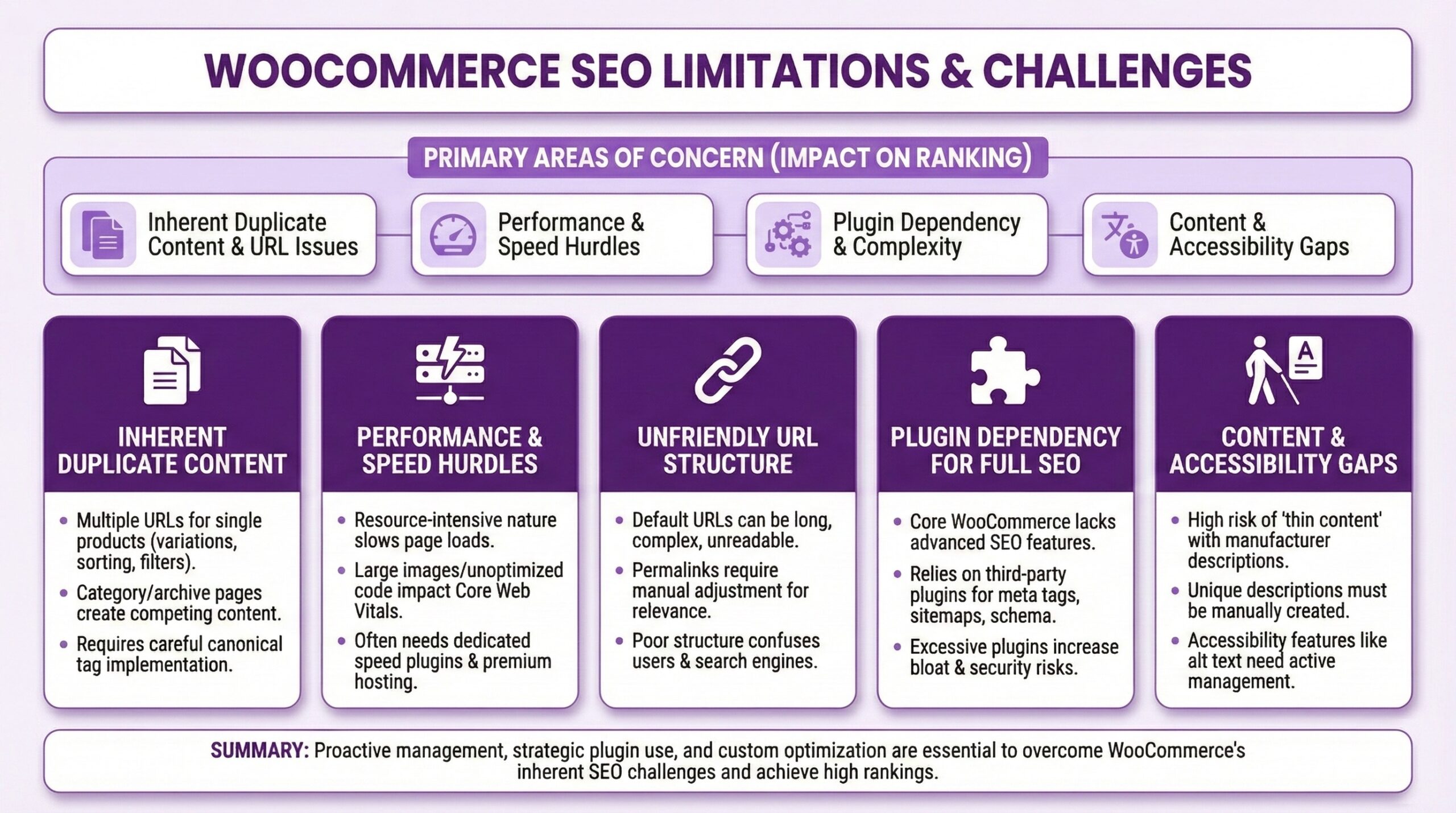 Site speed degradation. WooCommerce stores notoriously slow down as they scale. Every plugin adds database queries. Every theme customization adds rendering time. By the time you’re doing serious volume, your site speed has usually become a genuine SEO liability. Core Web Vitals scores suffer, and Google notices.