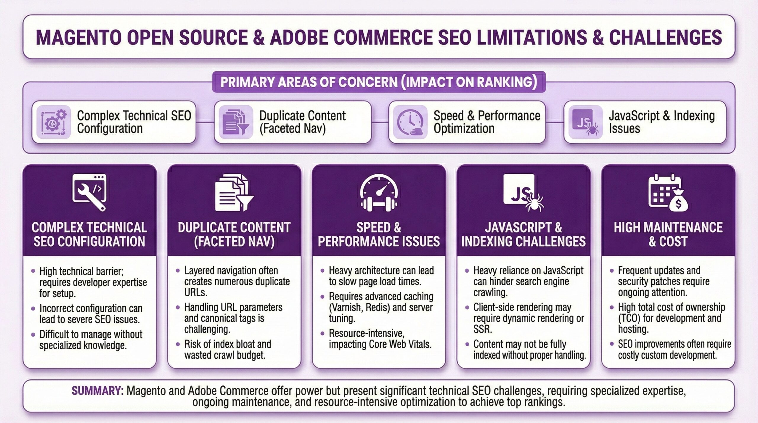 Both Magento Open Source and Adobe Commerce offer retailers a lot of power and a lot of flexibility. They’re also tremendously complex and expensive to maintain properly. The SEO challenges are less about each platform limitations and more about their operational overhead.