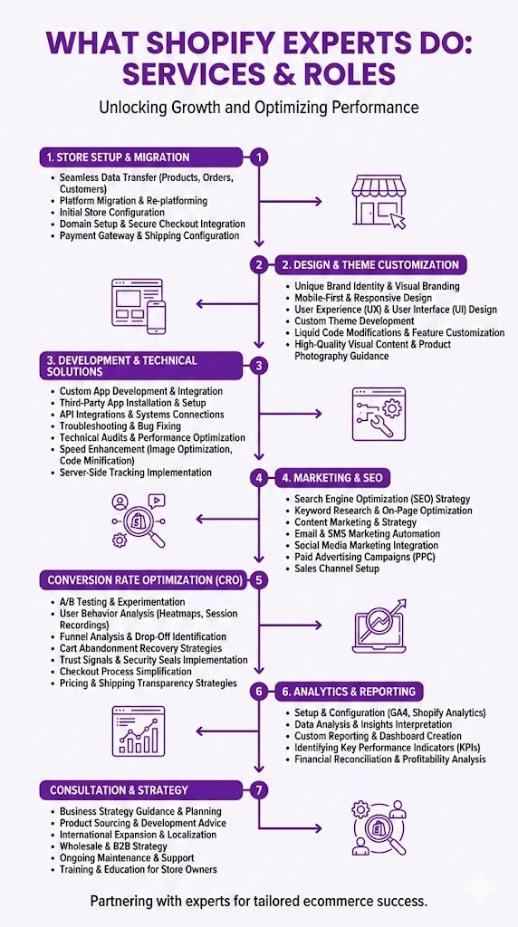 The Shopify ecosystem is massive, and so are the types of experts you can find. They generally fall into a few key categories, each focused on a critical part of your retail business. Knowing these roles helps you narrow down your search to find better fits.