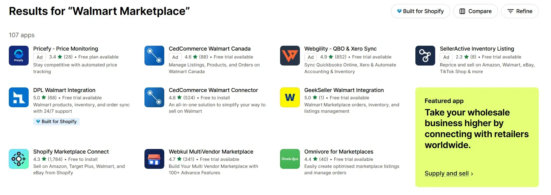 For Walmart Marketplace integration, your options will be more limited and more expensive. Shopify’s official app is Walmart Marketplace Connect, it’s free to install, but requires approved Walmart seller status. It’ll handle basic integration but sadly lacks advanced features like bulk editing and custom field mapping. CedCommerce’s Walmart Connector arguably leads the third-party options. Their app provides real-time synchronization, bulk operations, and critically, proper error handling for Walmart’s Byzantine validation rules. Ced support actually understands Walmart’s requirements, which’ll be worth the price when you’re troubleshooting a rejected feed.