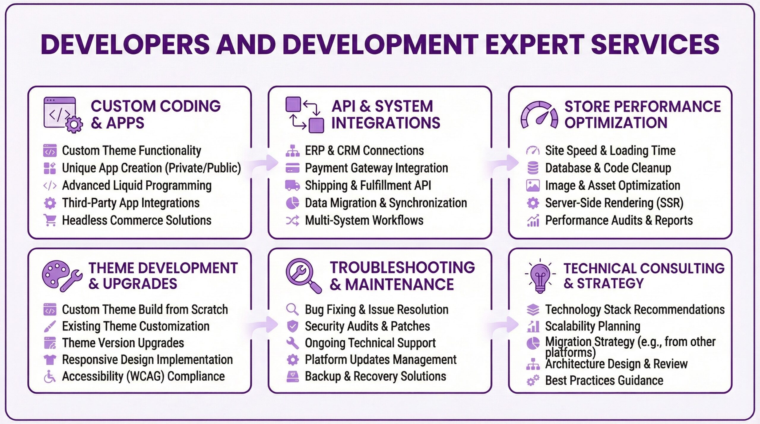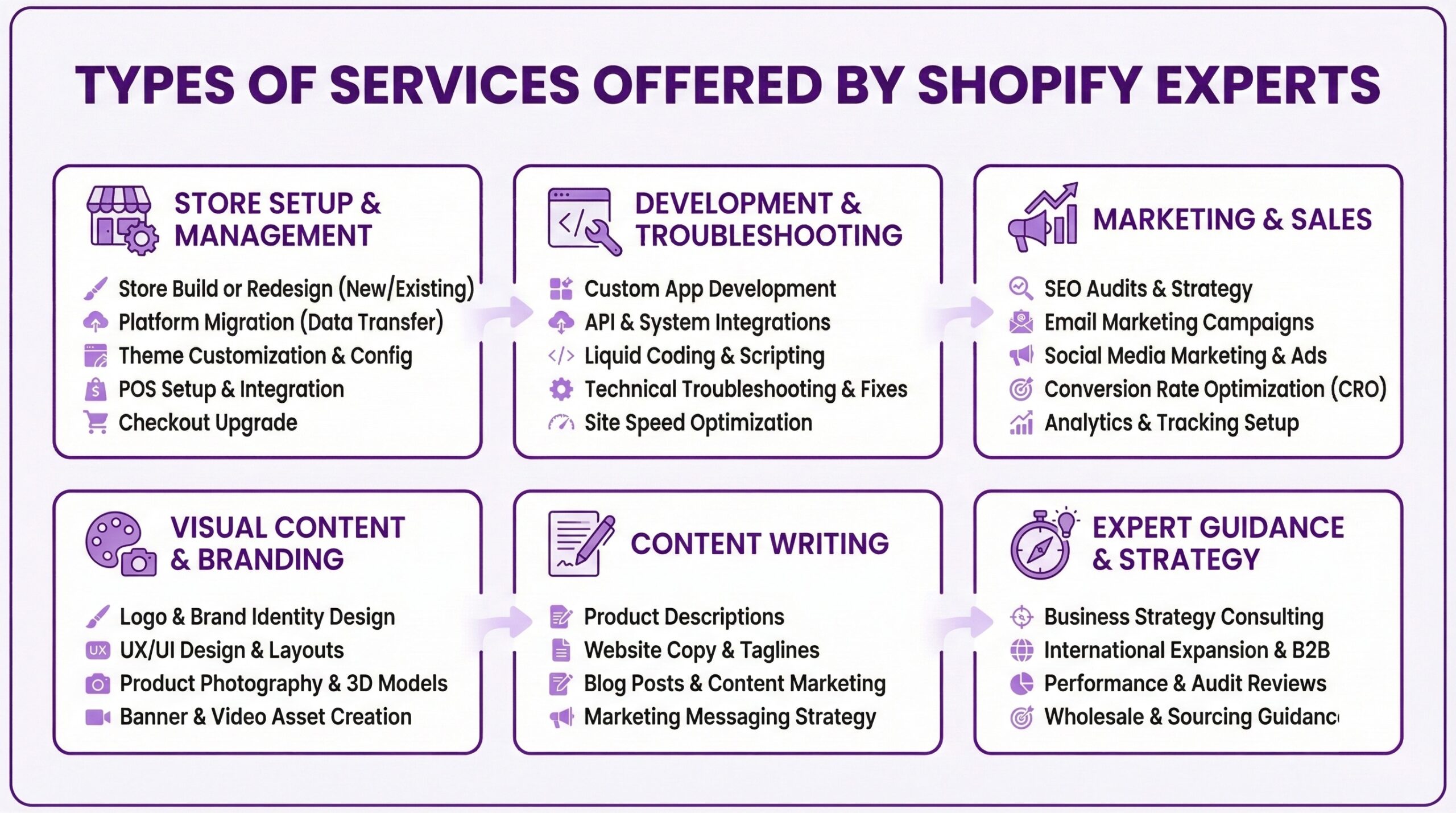 Shopify Experts are specialists who offer professional services across a few categories. For instance. Development experts handle custom coding, app building, and technical integrations. Theme experts customize store appearance and user experience. Migration experts move stores from platforms like WooCommerce, Magento, or BigCommerce while preserving data and SEO equity. Performance experts optimize site speed and Core Web Vitals. SEO experts handle platform-specific search optimization. Store setup experts configure new stores from scratch including payment systems and product organization. Some experts specialize narrowly in one area while others offer services across multiple categories.
